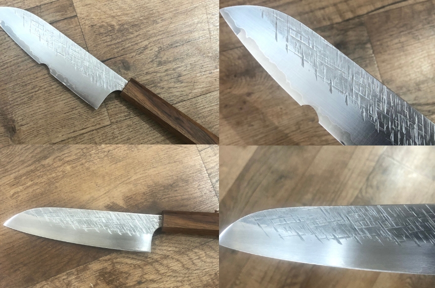 Réfection du tranchant, avec affûtage sur une machine à bande abrasive sur lame de plus de 15 cm.